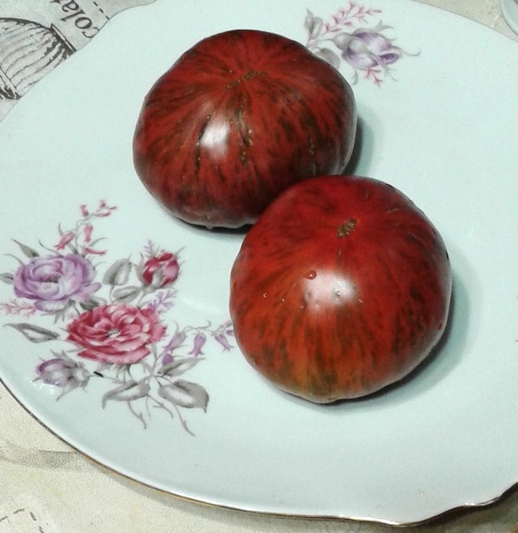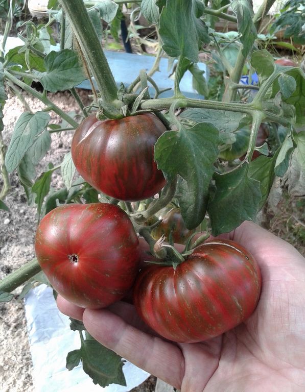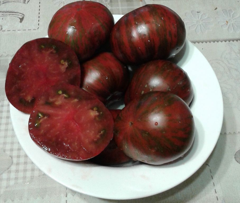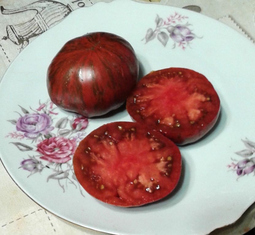 - Индет, высокорослый, до 1,8 м. Плоды - сочные бифы, полосатые с бордовой мякотью.