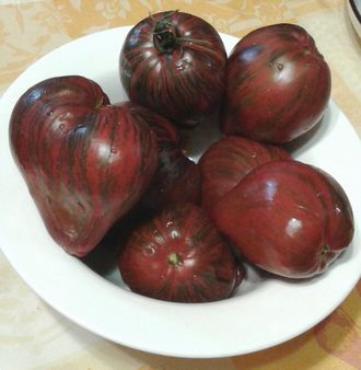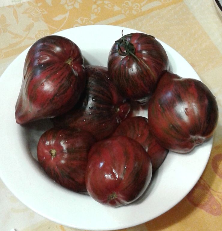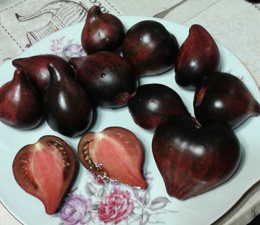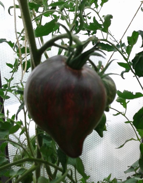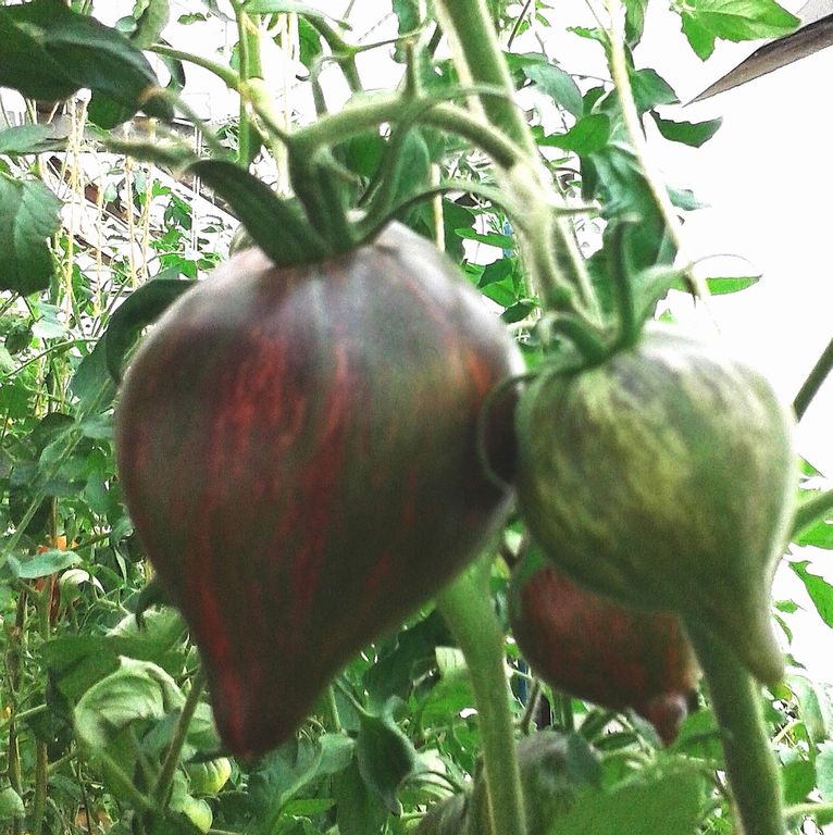 - Высокорослый индет, до 2 м, среднеранний сорт томатов. Плоды- сладкие малиново-полосатые сливы с носиком, с антоцианом.