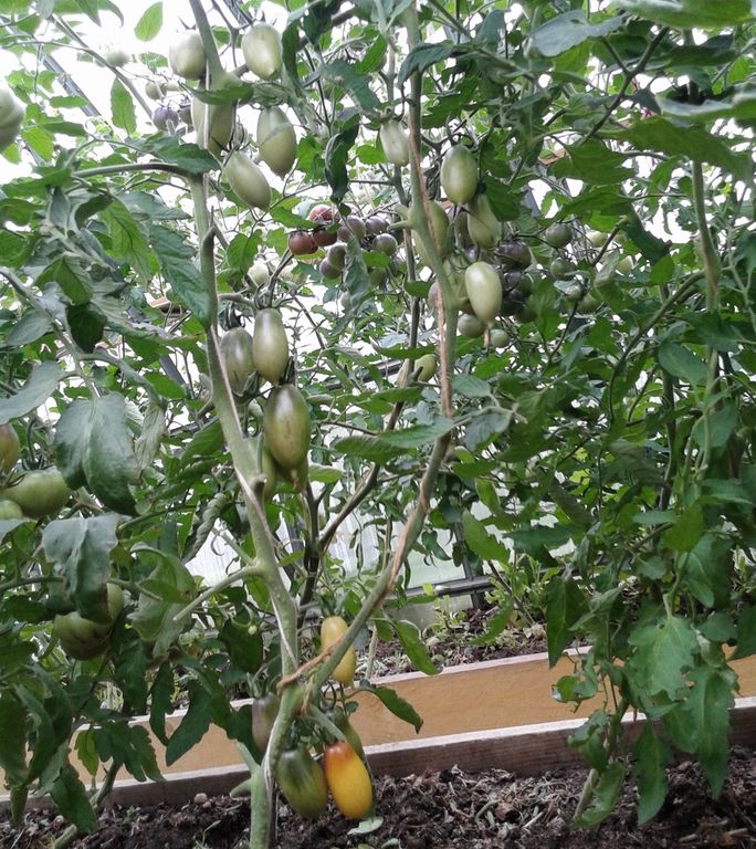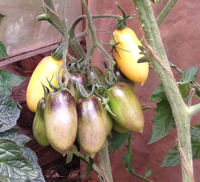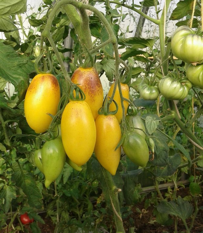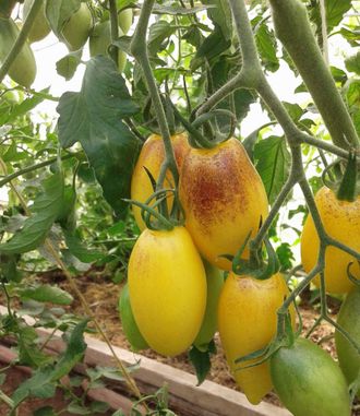 - Индет, высокорослый, в теплице 1,8 м. среднеспелый, длительного плодоношения. Плоды - удлиненные сливки лимонного цвета.