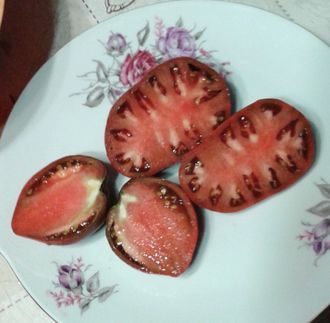 - Урожайный индет, высокорослый, до 1,8 м. Удлиненно-сердцевидные, фиолетово-розовые, вкусные плоды.